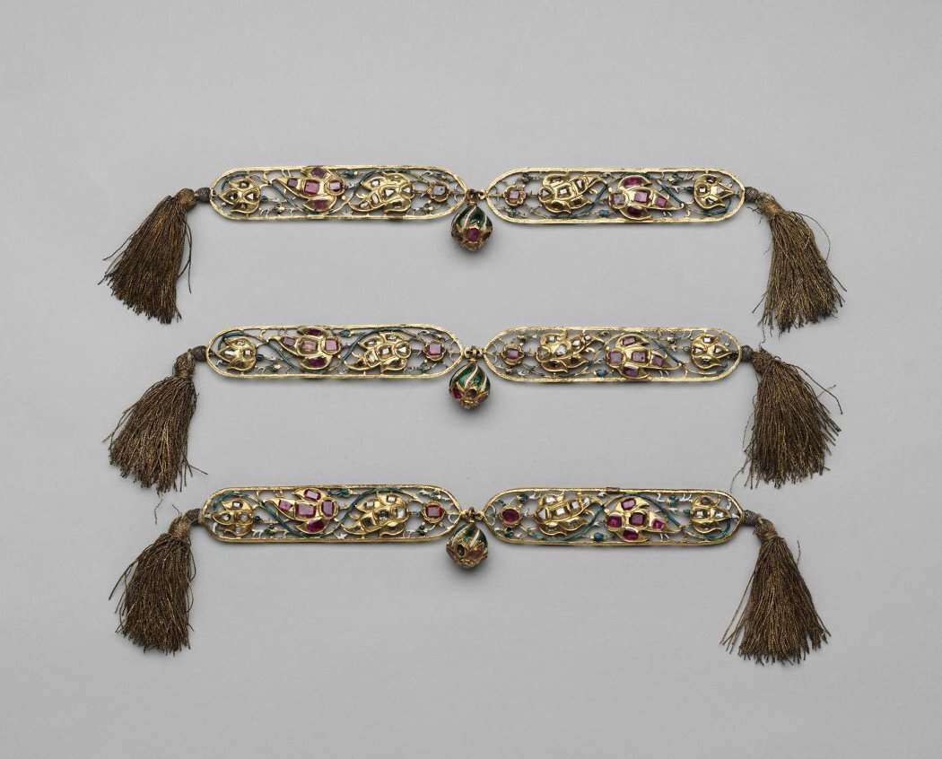 Запоны — особый вид изделий для украшения русского костюма допетровской эпохи. Их привозили в Москву из Стамбула – столицы Османской империи. Эти предметы не имели прямых аналогий в ювелирном искусстве других стран. Запоны выпускались разных размеров и самых причудливых форм — в виде цветов тюльпана и гвоздики, плодов граната, разнообразных листьев и бутонов, многолучевых звезд. Орнамент из крупных стилизованных плодов граната, заполненных зернышками-рубинами, относится к наиболее распространенному мотиву декора ювелирных изделий, выходивших из стен султанских придворных мастерских в XVII в. Иногда ажурные края отделывались прямоугольной рамкой, которая украшалась тончайшими эмалевыми, черневыми или резными узорами. Прямоугольные ажурные золотые запоны с драгоценными камнями нашивались по подолу и вдоль пол парадной одежды русских царей, цариц и царских детей. Головные уборы тоже украшались запонами. На платне царя Федора Алексеевича было на полах по «10 запон с яхонты и с изумруды; на