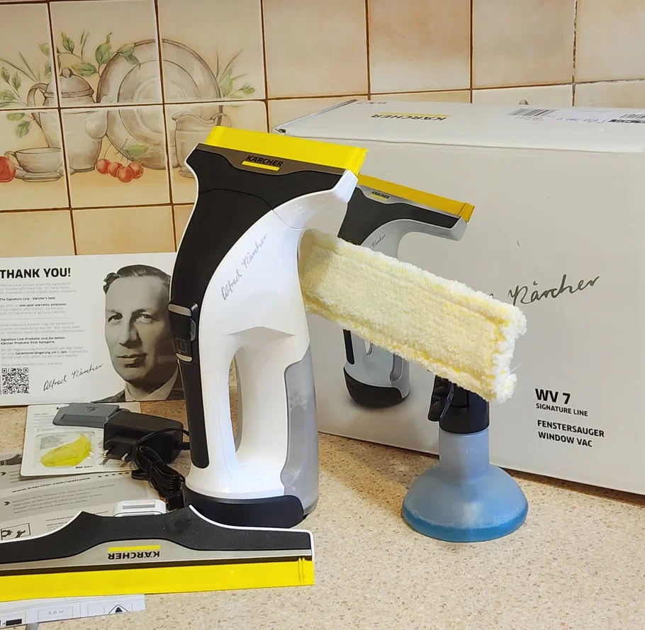Мне надоело лицезреть грязные окна после долгой зимы. Мыть окна вручную мне тяжело, ненавижу все эти тряпки и тазики. Работой клинеров я не всегда был доволен, моют окна долго, на стеклах видны разводы и следы высохших капель, особенно на солнце. Да и пускать домой незнакомых людей мне совсем некомфортно. Долго думал, как решить эту проблему. И вот, у меня стеклоочиститель Kärcher WV 7 Signature Line — новинка с автографом основателя компании Альфреда Керхера. В белоснежной коробке со стеклоочистителем Kärcher WV 7 Signature Line целый набор для очистки стекол и любых других гладких поверхностей. Стеклоочиститель довольно компактный и легкий, его удобно держать одной рукой. Разъем для зарядки сзади на подошве устройства. Итак, начнем мойку с WV 7 Signature Line. Принцип уборки такой: сначала распыляется моющее средство из пульверизатора на грязное стекло. Затем поверхность протирается насадкой с чистящей салфеткой. Вся грязь собирается на салфетке, которую потом можно снять и промыть,