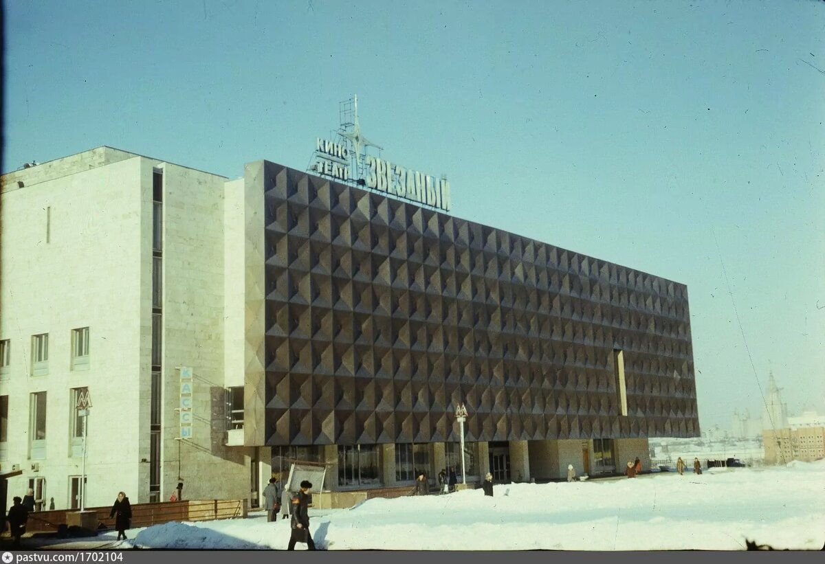 Сегодня, в День Космонавтики, поведаю вам о кинотеатре с «космическим» названием – «Звездном». Его открыли на проспекте Вернадского в 1974 году. Проектом занимались архитекторы Георгий Чалтыкьян и Виктор Шер. Главной отличительной чертой этого строения стал его знаменитый фасад. В отличии от стандартных типовых кинотеатров 1970-х гг., которые представляли собой прямоугольную коробку из стекла и бетона, «Звездный» облицевали квадратными панелями из алюминия, тонированного под бронзу. Смотрелось это весьма интересно и броско: похожими фасадами могли похвастаться лишь павильоны «Радиоэлектроника» и «Вычислительная техника» на ВДНХ (в 2014 году их демонтировали). Алюминий, правда, со временем потускнел и потемнел от копоти. Но именно в таком виде он и запомнили местные жители (ваш покорный слуга в том числе). Внутри изначально предполагалось разместить 3 зала, совокупно вмещающие 2000 человек. Однако по требованию Моссовета их пришлось сократить до двух залов, на 1000 и 400 мест. Также его