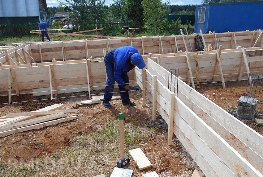 По обеим сторонам траншеи строго вертикально вбиваются опорные стойки с шагом, равным длине опалубочного щита. Для стоек используется брус сечением от 50х50 мм и больше. Стойки углубляются в грунт на 50–70 см. По опорным стойкам выставляются и крепятся первые маячковые щиты. Середина опорных стоек по вертикали является местом сплачивания следующих щитов.