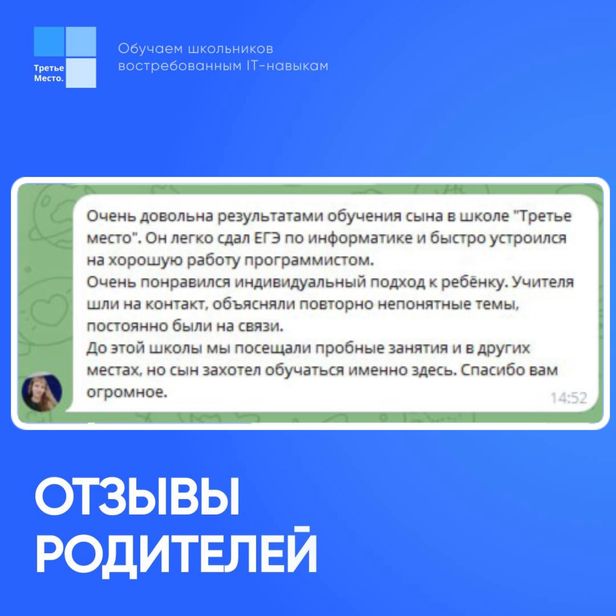Отличные новости в нашей школы программирования "Третье место"! 🎉 Наши ученики не только изучают программирование, но и успешно сдают ЕГЭ и ОГЭ по математике, информатике, английскому языку и другим предметам! Это большое достижение и показатель того, что мы движемся в правильном направлении. Но что ещё более важно, выпускники устраиваются на работу, которая открывает перед ними большие перспективы на будущее. Вот отзыв одной из мам наших учеников: “Очень довольна результатами обучения сына в школе "Третье место". Он легко сдал ЕГЭ по информатике и быстро устроился на хорошую работу программистом. Очень понравился индивидуальный подход к ребёнку. Учителя шли на контакт, объясняли повторно непонятные темы, постоянно были на связи. До этой школы мы посещали пробные занятия и в других местах, но сын захотел обучаться именно здесь. Спасибо вам огромное.»🚀