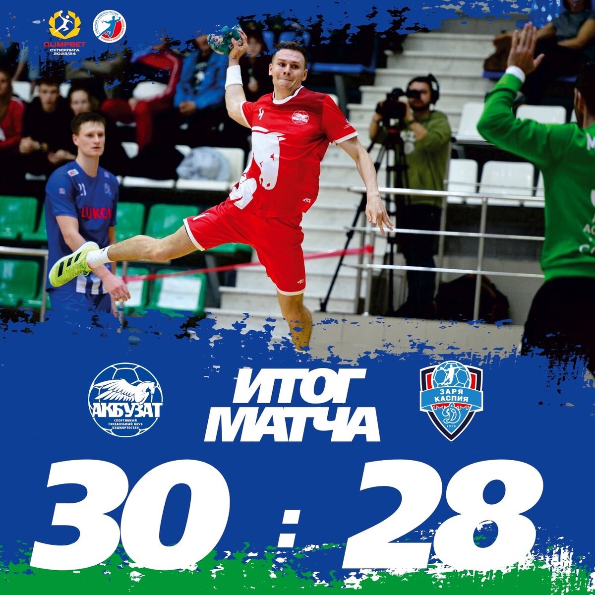 В последнем матче регулярного сезона "Акбузат" обыграл астраханское "Динамо", поднявшись на одну строчку и обеспечив себе хорошее настроение перед стартующим совсем скоро утешительным турниром. БЦ подмечает ключевые моменты уфимской встречи. Мужчины. Olimpbet Суперлига 12.04. Акбузат (Уфа) — Динамо (Астрахань) — 30:28 (12:13) Судьи: Анташев, Мусатов. Акбузат: Серов (1/2=50%), Попов (12/39=30%); Лукьянцев (7/7), Василенко (1/1), Мишин (2/6), Князев (1/2), Гноевой (3/5), Мишустин (3/3), Артамонов (0/1), Тропин (3/3), Трушин (3/5), Томилин (н/в), Рябич (3/4), Злыгостев, Калугин (4/6), Латыпов (0/1). Динамо: Корякин (6/26=23%), Максутов (2/12=16%); Гумаров (2/4), Климентьев (1/3), Кантемиров (3/6), Дроздов (4/5), Гордеев (5/8), Ухваркин (1/6), Овчарук, Косенков (3/3), Фильчев (1/1), Шелестюков (3/7), Востриков (2/2), Васильев (3/5). Итоговое положение (у всех по 22 матча).1.ЦСКА — 40 очков. 2.Чеховские медведи — 38. 3.Зенит — 31. 4.Пермские медведи — 27. 5.Виктор — 25. 6.СКИФ — 23. 7.Динам