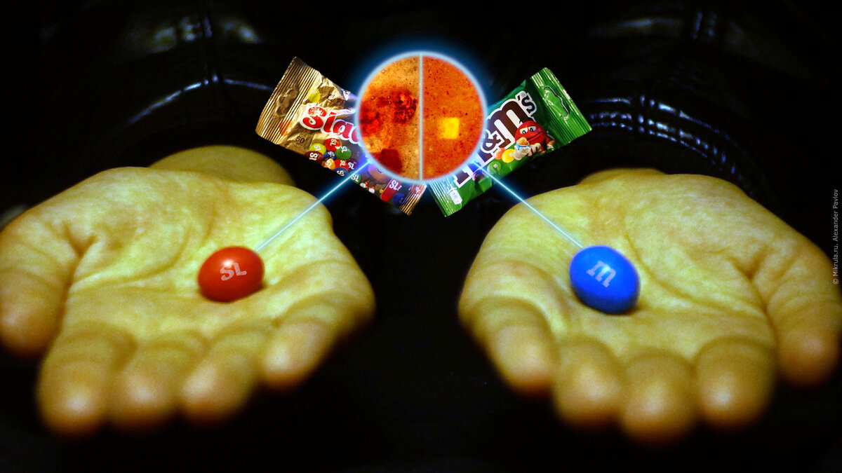 Глазированный арахис от двух производителей отличается значительной разницей в цене. Хотя на первый взгляд драже выглядят одинаковыми. Поверхность у обоих вариантов идентична и под микроскопом — подкрашенная глазурь, в которой встречаются частички не растворившегося красителя. Самое интересное, конечно же, внутри. Рассечём конфеты и поместим их под пристальный объектив микроскопа. Шоколадная оболочка у Сладуса почти в два раза толще, чем у его конкурента. При этом она же и мягче, так как срез получается ровным и слегка размазанным, в то время как у M&M’s шоколад крошится, а это значит — он более твёрдый. Толщина оболочки в обоих драже примерно одинаковая. Однако соотношение слоя сахарной (белой) глазури к окрашенной отличается. У M&M’s твёрдый только самый верхний слой, а белая глазурь выглядит рыхлой. Поэтому раскусывать такую конфету проще и при жевании она легко рассыпается. Всё это стало возможным благодаря повышенной плотности шоколада. Кстати, нам попался вариант с солёным шоко