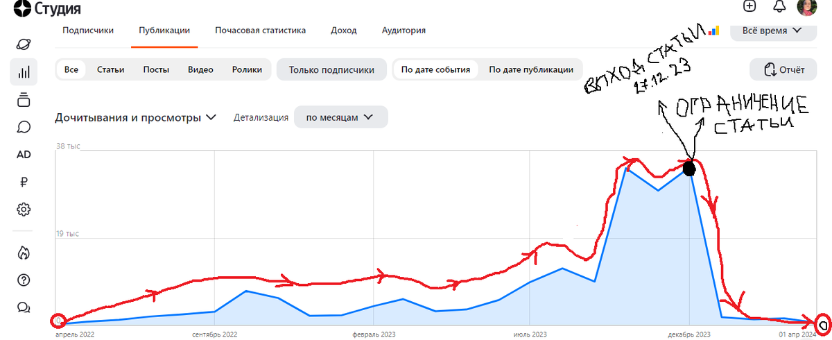 Итак, как вы уже в курсе из этой статьи после того, как Дзен ограничил мою статью "Счастье ближе, чем кажется" -27.12.23, якобы за откровенный контент, сразу после этого менее чем за 2 дня мой канал рухнул в ноль и это после того как с самого его начала мой канал стабильно шел в рост. Со слов поддержки Дзена их ограничение (которое было, как я это выяснила, выставлено ошибочно) вообще не при чем. Ну да конечно на графике особенно видно, как их ограничение ну прям совсем "не при чем"))