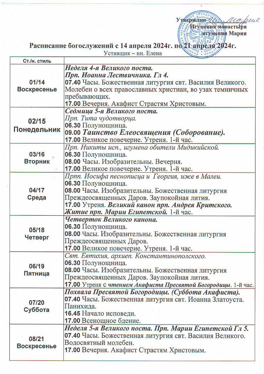 14-21.04. Расписание богослужений в Введенском женском монастыре города Иваново