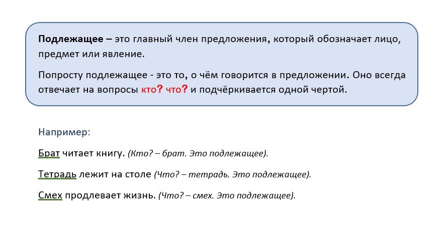 1. ПОДЛЕЖАЩЕЕ. 2. СПОСОБЫ ВЫРАЖЕНИЯ ПОДЛЕЖАЩЕГО. Дальше мы рассмотрим каждый способ выражения подлежащего в отдельности и подробно. ПОДЛЕЖАЩЕЕ-СУЩЕСТВИТЕЛЬНОЕ. Для того, чтобы с лёгкостью находить подлежащее в предложении, нужно перебрать как можно больше примеров. Для этого рассмотрим, какие бывают подлежащие-существительные. 1. Лицо - это человек. Задание 1. Устно. Придумай 10 предложений, в которых подлежащее будет выражено существительным женского или мужского пола, обозначающим лицо. Проговаривай вслух весь порядок слов, как в примере. Для примера: Сестра моет руки перед едой. (Кто? - сестра. Сестра - это подлежащее, обозначает лицо женского пола). Задание 2. Письменно в тетради. Найди в предложениях подлежащее, спиши предложение, подчеркни подлежащее и допиши в скобках разъяснение, как в примере. Прикрепи фотографию выполненного задания. Для примера: 1. Мама варит обед. (Кто? - мама. Мама - это подлежащее, обозначает лицо женского пола). 1. Мама варит обед. 2. Дядя учит нас прыг