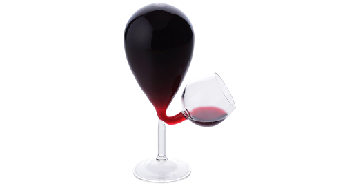 Стеклянный, непонятной формы резервуар представляет собой емкость в форме шара с бокалом для вина. Когда количество жидкости в стакане уменьшается, из емкости доливается новая порция. Поэтому ты пьешь вроде как из стакана, но на самом деле держишь в руках всю бутылку. Я вот не очень понимаю, как такое держать в руках....