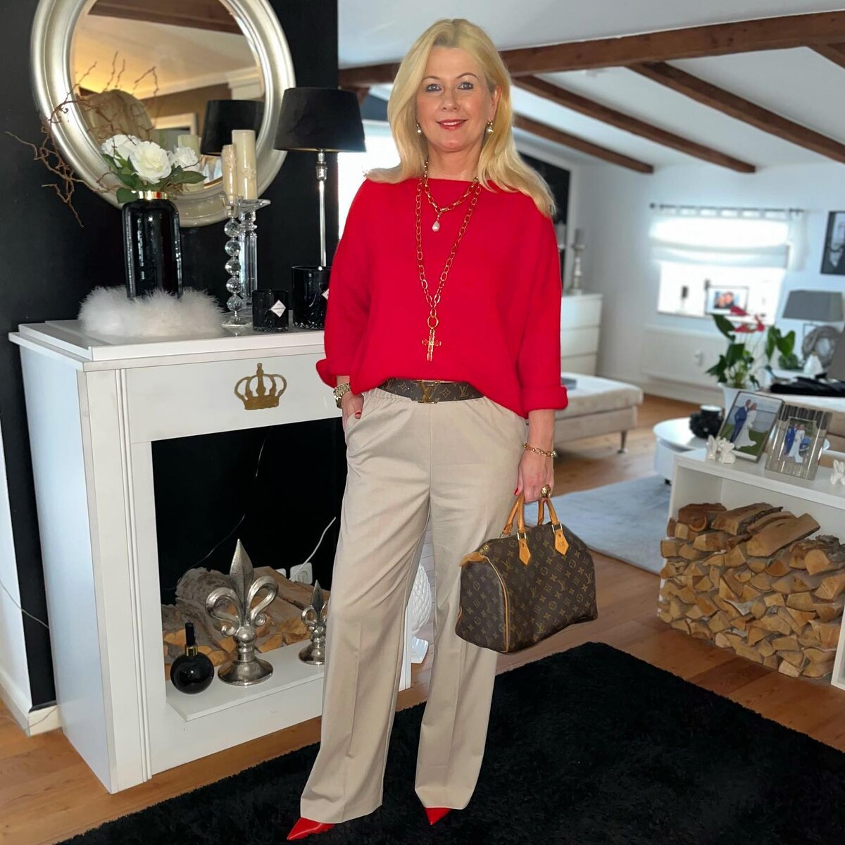 Свободный джемпер великолепно сочетается с брюками широкого кроя и остроносой обувью. Нейтральный беж успешно «приглушает» выразительный алый оттенок, сумка гармонирует с кожаным поясом.