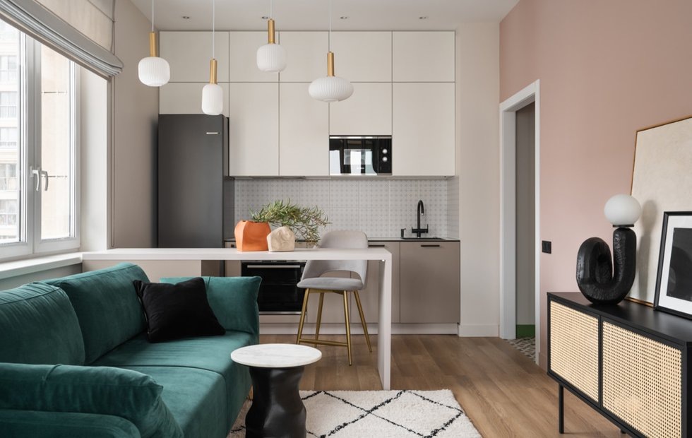 Несмотря на скромную площадь, получилось обустроить кухню-гостиную, спальню, расширить санузел, выделить гардеробную и спроектировать много мест хранения Место: Москва Метраж: 48 кв. м Год реализации: 2022 Комнаты: 1 Высота потолков: 2,9 м Дизайн: Мила Генч Стилист: Ирина Темнова Фото: Андрей орехов Хозяева этой небольшой двухкомнатной квартиры в новостройке — активные люди, всегда на позитиве, поймать их дома практически невозможно, у них много совместных хобби, живут интересно и нескучно. Дизайнеру Миле Генч предстояло создать для них функциональный интерьер с большим местом для хранения, но при этом не тесный и наполненный воздухом. Для создания максимально удобного пространства потребовалась перепланировка. Дизайнер убрала ненужный коридор, сделала вместо него вместительную гардеробную. Также обустроили эргономичную кухню-гостиную с зоной отдыха. Кухня линейная, идеально вписана от стены до стены, хотя сделана по стандартным размерам. Техника в основном встроенная, но холодильник р