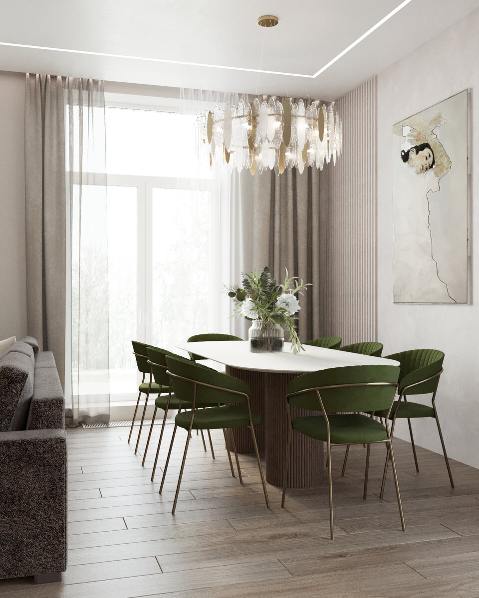 Начинаем новый проект – интерьер коттеджа в поселке «Классик» г. Пушкино. Очень красивое, живописное место, со всех сторон окруженное лесом. Дом одноэтажный, сложен из пеноблоков. Фасады отделаны мелкой штукатуркой с использованием декора (облицовочный кирпич, фасадная доска), есть терраса. Клиенты выбрали для своего жилья неоклассический стиль. Кухня-гостиная Мы взяли бежевую гамму с оттенками разной тональности, а в качестве акцента – детали кухонных фасадов графитового цвета и стулья цвета хвои. Декор – отделка реечными панелями. Помещение просторное, есть место и для камина, и для уютного семейного дивана. Безусловным украшением комнаты стала декоративная каменная панель под телевизор. Поверхность с серо-бежевым рисунком природной красоты отлично смотрится днем. А вечером подсвечивается встроенными светильниками. Панель можно выбрать из двух вариантов: Рабочая зона кухни в сливочных оттенках выглядит очень нежно, она также отделана керамогранитом. Часть 2 здесь Подписывайтесь, с