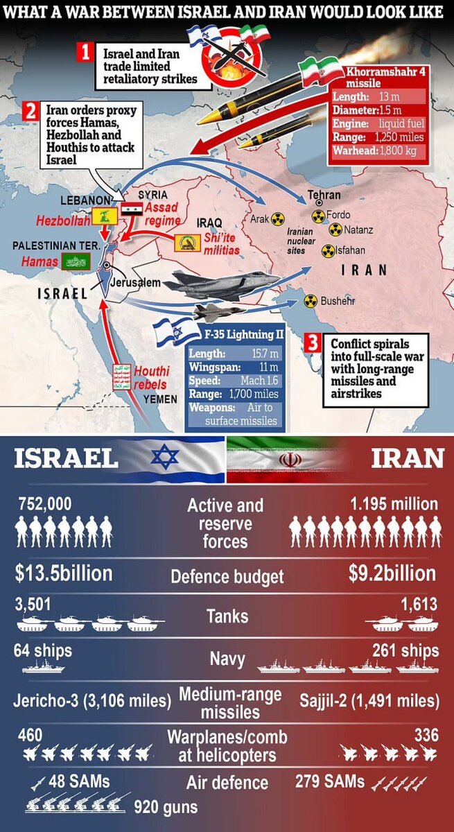 Daily Mail: сравнение армий Израиля и Ирана на фоне угроз атак Тегерана Британская газета Daily Mail сравнила военные потенциалы Израиля и Ирана. Согласно вышеуказанной инфографике, численность армии Ирана (ок. 1.2 млн чел.) превышает израильскую (762.000 чел). Но при этом у Израиля вдвое больше танков и преимущество в количестве военных самолетов, в отличие от Тегерана. Израиль заявил, что не желает войны с Ираном и Ливаном, но ответит в случае атаки «Информационный бум» вокруг возможной атаки Ирана на Израиль США, Израиль и Иран привели свои ВС в состояние повышенной готовности #Израиль #Иран Подписаться на канал AZfront