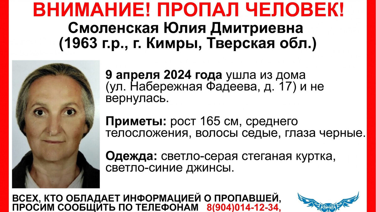 В Кимрах Тверской области пропала Юлия Дмитриевна Смоленская 1963 года рождения. Как сообщает тверской волонтерский поисково-спасательный отряд "Сова", 9 апреля пожилая женщина ушла из дома (Кимры, ул. Набережная Фадеева, д.17) и не вернулась. Приметы:рост 165 см, среднего телосложения, волосы седые, глаза черные. Одежда:севтло-серая стеганая куртка, светло-синие джинсы. Всех, кто обладает информацией о пропавшей, волонтеры просят позвонить по телефонам: 8 (910) 646-34-34, 8 (904) 014-12-34