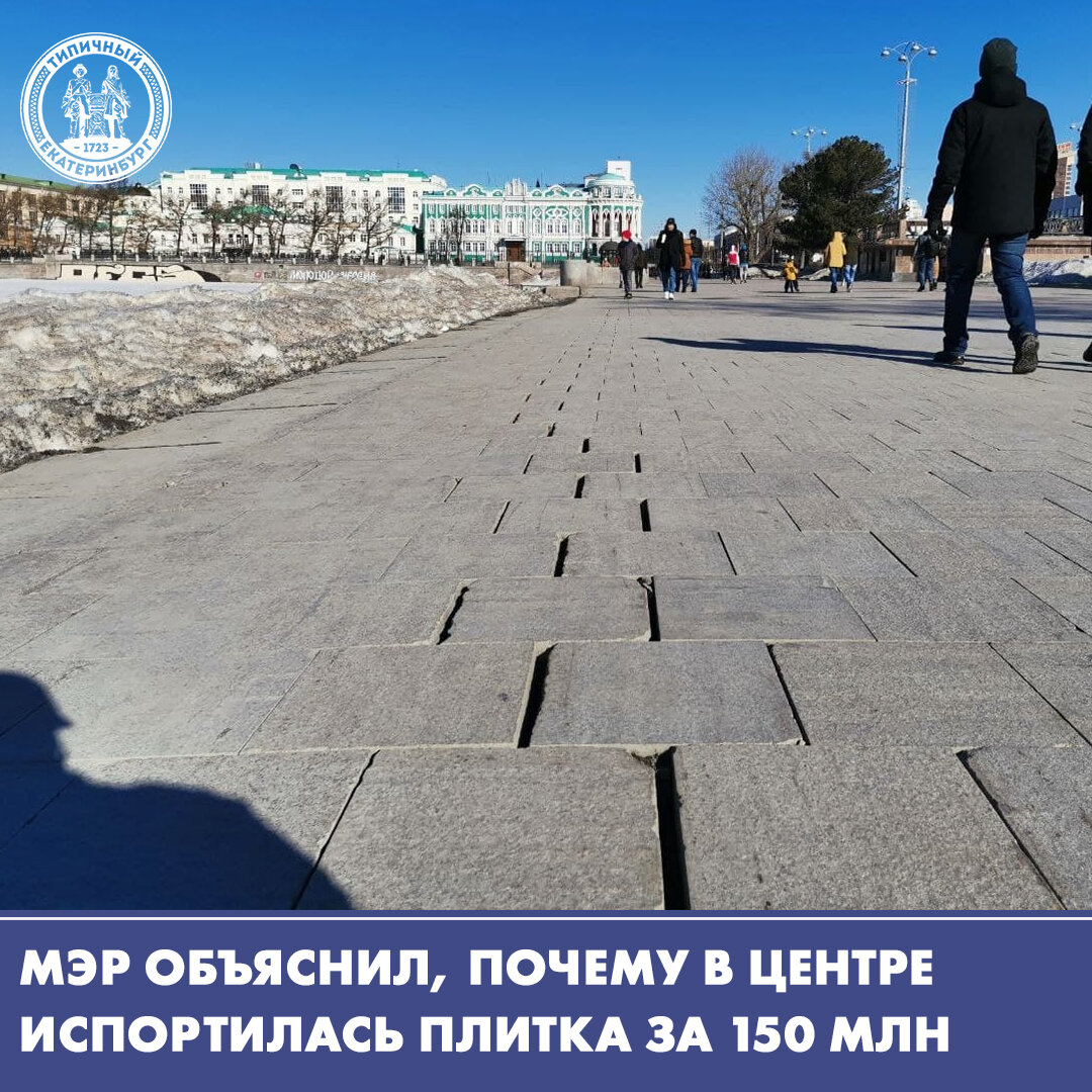 Глава Екатеринбурга Алексей Орлов объяснил, что плитка в центре города испортилась из-за плохой погоды. Покрытие уложили летом прошлого года, перед 300-летием Екатеринбурга, потратив на ремонт Исторического сквера и прилегающей территории 150 млн рублей. Однако с наступлением весны по плитке стало невозможно ходить из-за глубоких щелей и выбоин. Покрытие развалилась на Плотинке, на проспекте Ленина, в сквере за Оперным театром, а также вдоль сквера на Мамина-Сибиряка. Отвечая на вопрос журналистов о состоянии покрытия, градоначальник рассказал, что всему виной суровый уральский климат. — Зима была с большим количеством осадков, были перепады температур. Сначала выпал снег, потом растаял. Затем — вновь всё замерзло. Естественно, что покрытие, брусчатку и асфальт теперь просто разрывает, — объяснил мэр. Также он добавил, что плитку начнут приводить в порядок, как только потеплеет.