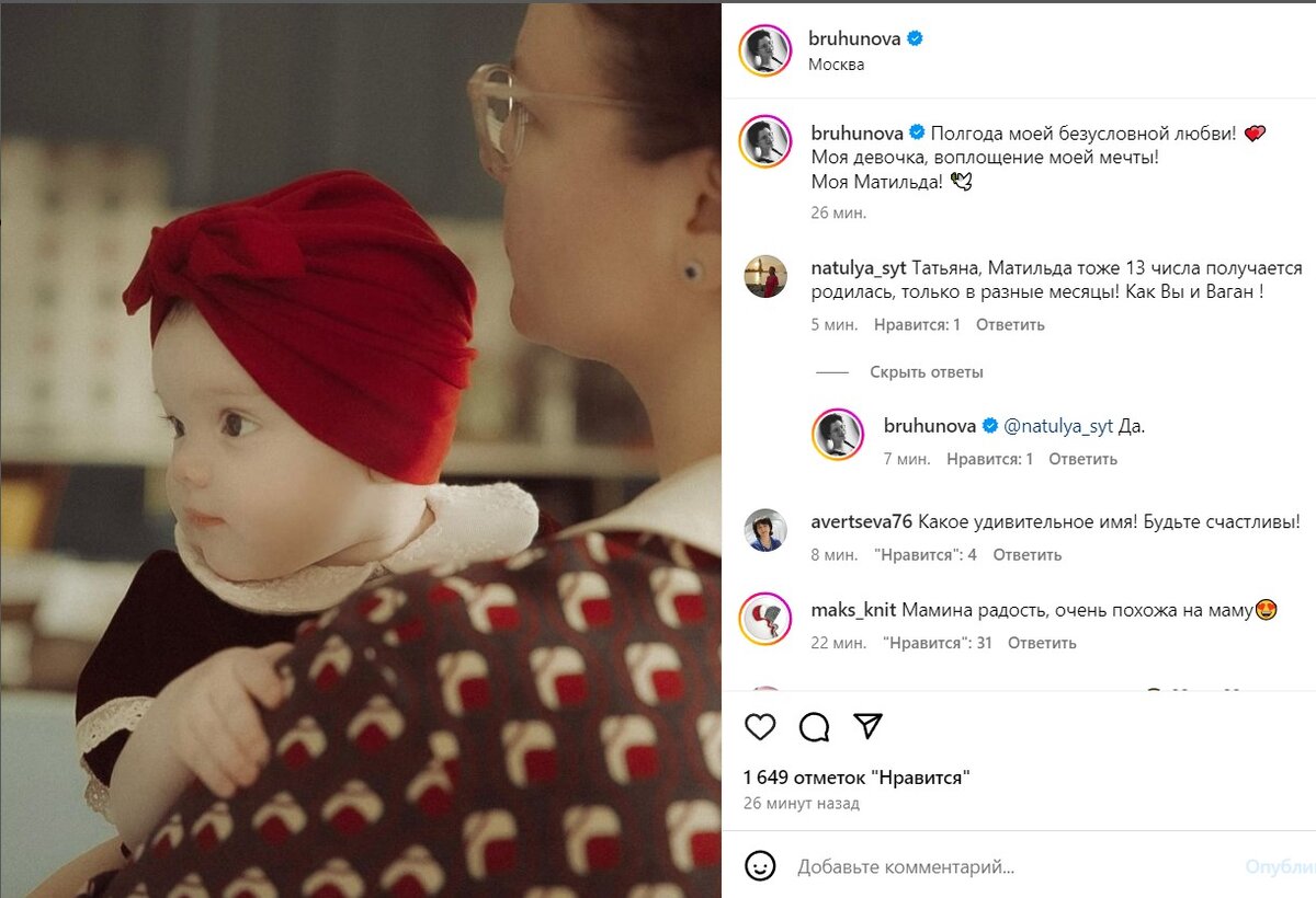 В личном микроблоге супруга Евгения Петросяна, Татьяна Брухунова, впервые показала личико малышки. Сегодня, 13 апреля, девочке исполнилось полгода. На опубликованном фото кроха запечатлена на руках у матери. Малышка облачена в черное платье с кружевным воротничком, на ее головке красный тюрбан. «Полгода моей безусловной любви! Моя девочка, воплощение моей мечты! Моя Матильда!» — написала Брухунова под фото. Публика пришла в восторг от снимка малышки. Маленькая Матильда, как пишут обитатели Сети, растет настоящей красавицей и модницей. Отмечается также, что крошка совсем не похожа на Евгения Петросяна. Девочка – копия своей мамы Татьяны. Соцсети Татьяны Брухуновой «Какое удивительное имя! Будьте счастливы!», «Мамина радость, очень похожа на маму», «Очень нежное имя, на маму похожа. Красотка», «Нарядная, вся в маму», «Мамина сладкая булочка», «Лапушка какая и на вас похожа», «Куколка и очень похожа на маму!», «Какая красивая, на вас Таня похожа!» — пишут подписчики супруге Евгения Ваган