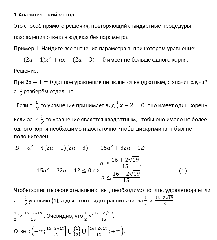 Цель данной работы – изучение различных способов решения задач с параметрами. Возможность и умение решать задачи с параметрами демонстрируют владение методами решения уравнений и неравенств, осмысленное понимание теоретических сведений, уровень логического мышления, стимулируют познавательную деятельность. А также, всего 10% школьников приступают к решению задач с параметрами, потому что они не понимают как их решать. И лишь 3% из людей, которые понимают Существуют 4 больших класса задач с параметрами: 1. Уравнения, неравенства и их системы, которые необходимо решить для любого значения параметра, либо для значений параметра, принадлежащих определённому множеству. 2. Уравнения, неравенства и их системы, для которых требуется определить количество решений в зависимости от значения параметра. 3. Уравнения, неравенства и их системы, для которых требуется найти все те значения параметра, при которых указанные уравнения (системы, неравенства) имеют заданное число решений. 4. Уравнения, не
