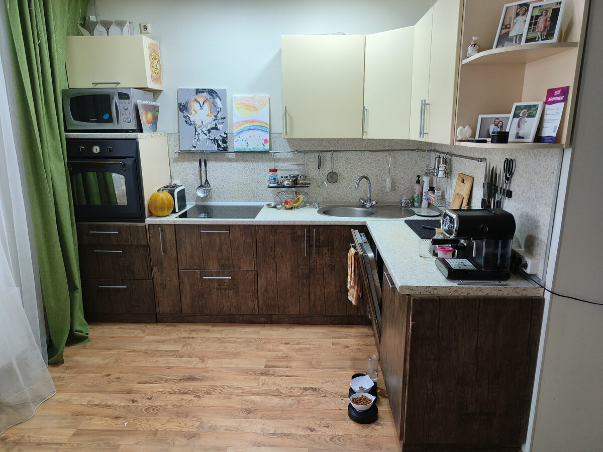 Всем доброго времени суток! Рад всех видеть у себя в гостях) У нас сегодня немного неформат, но раз это касается кухни, на которой я творю в свободное время - решил поделиться с вами началом масштабного ремонта. Будет несколько частей о преображении одной из самых любимых комнат в квартире. На момент выхода первой части еще нет готового результата и предлагаю пройти этот путь вместе со мной! В первых двух частях покажу на собственном примере как бюджетно можно визуально очень сильно изменить оформление комнаты. Поехали! И так, наступили дождливые холодные выходные и лучшим времяпрепровождением было это начать ремонт и преображение кухонного гарнитура. Наконец! Как бы вы знали как надоела торчащая и цепляющая за другие ящики вспухшая пленка! Вы даже не представляете с каким удовольствием было пару раз дернуть за нее резким движением)) Но по факту, всё что нужно, что того чтобы снять пленку, не повредим дверцы - взять фен. Не обязательно строительный, подойдет самый простой,