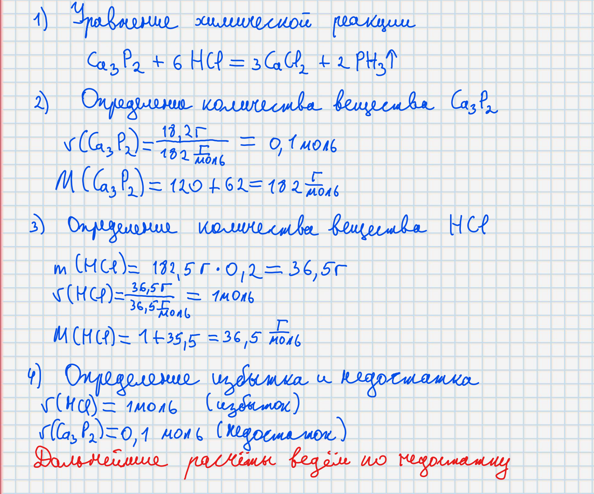 К фосфиду кальция массой 18,2 г прилили 182,5 г 20% раствора соляной кислоты. К полученному раствору добавили 200,2 г кристаллической соды Na2CO3 * 10H2O. Определите массовую долю карбоната натрия в конечном растворе. Для решения задачи необходимо написать уравнения химической реакции и определить количество вещества. В данной задачи возможно определить количество вещества у двух соединений. Поэтому в дальнейших расчётах необходимо использовать меньшее количества вещества, то есть недостаток. Кристаллическая сода даётся в избытке. Поэтому часть кристаллической соды ещё останется не использованной в реакциях, то есть будет остаток количества вещества и массы. Массу оставшейся соды и необходимо найти. далее, рассчитать массовую доля этого вещества. В реакциях количества вещества кристаллической соды и карбоната натрия считать равными! Мой телеграмм канал с теорией школьного курса химии и подготовки к экзаменам https://t.me/renatchemist