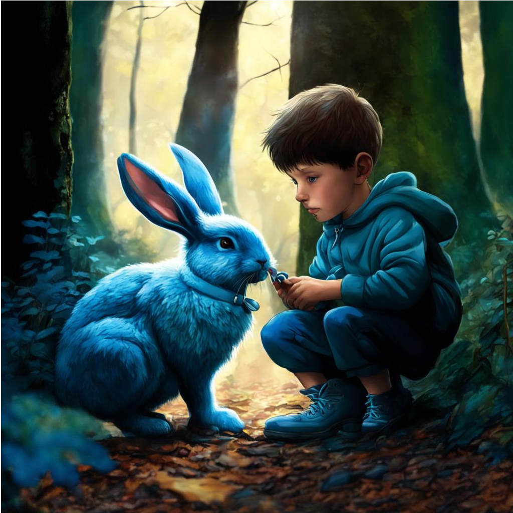 Однажды, когда сын семьи, маленький Томми, отправился в лес за орешками, он наткнулся на необычного кролика — это был кролик с голубыми ушами! Томми был в восторге и решил, что этот кролик должен стать членом их семьи. Он позвал к себе на помощь своих родителей, чтобы они помогли ему поймать этого необычного кролика. Когда вся семья собралась в лесу, они начали охоту на голубоухого кролика. Отец носит костюм кролика, мать размахивает кроличьим хвостом, а Томми кричит: “Голубой кролик, ты не сможешь уйти от нас!”