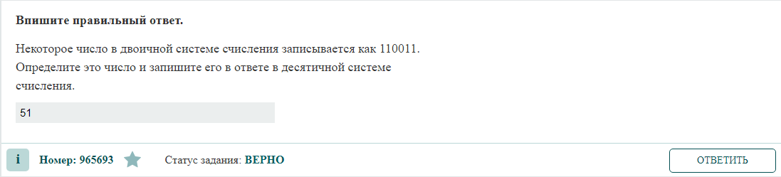 Некоторое число в двоичной системе счисления записывается как 110011. Определите это число и запишите его в ответе в десятичной системе счисления. ЧТО НУЖНО ЗНАТЬ? Правила перевода из двоичной системы счисления в десятичную Для того, чтобы перевести из 2-й в 10-ю необходимо умножить каждую цифру двоичного числа на основание “2”, возведенное в степень, равную разряду. Например, число 101₂= 1*2²+0*2¹+ 1*2⁰= 4+0+1= 5₁₀. РЕШЕНИЕ 110011₂=1*2⁵+1*2⁴+0*2³+0*2²+1*2¹+1*2⁰=32+16+2+1=51₁₀ ОТВЕТ 51