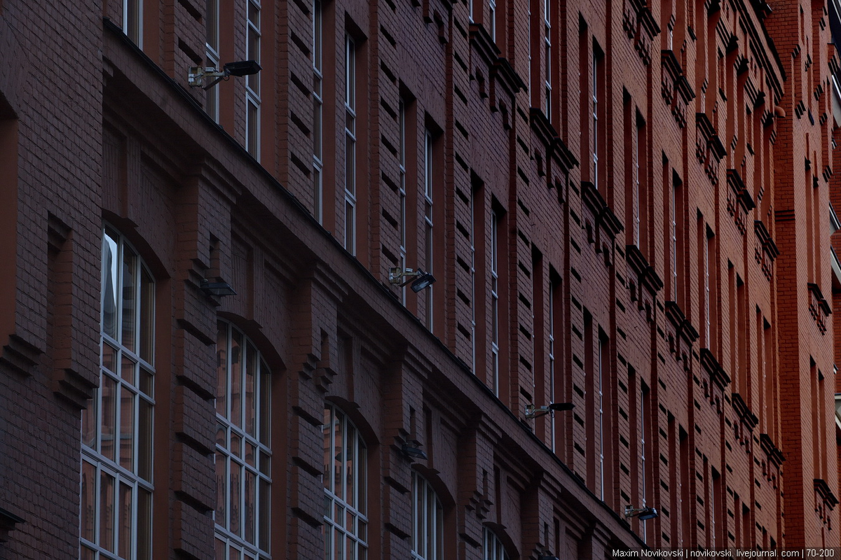 Московский кирпичный новострой - царство камня и стекла. Тут расположены офисы и днём весь офисный планктон заполняет улицу. А вечером тут тихо и спокойно.