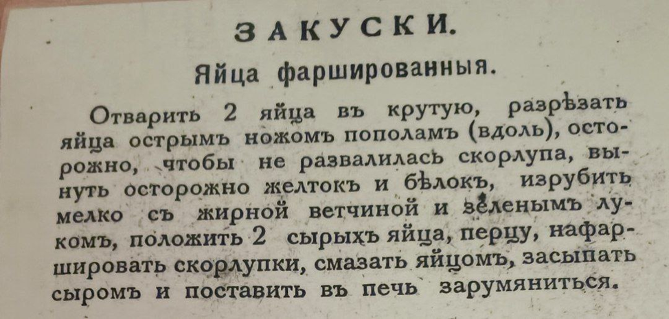 СТАРИННЫЕ РЕЦЕПТЫ. Как готовили наши предки сто и более лет назад. Начинаем цикл статей «старинные рецепты», рассмотрим рецепты приготовления разных блюд нашими предками в 18-19 веках. Пробуем готовить, оставляем комментарии!!! Закуски, салаты: Отварить два яйца в крутую, разрезать яйца острым ножом пополам (вдоль), осторожно, чтобы не развалилась скорлупа. Вынуть осторожно желток и белок, изрубить мелко с жирной ветчиной и зеленым луком. Положить два сырых яйца, перца, нафаршировать скорлупки, смазать яйцом, насыпать сыру и поставить в печь зарумяниться. Интересный рецепт, набор ингредиентов достаточно прост, но звучит вкусно (ветчина, зеленый лучок, яйцо). Пробуем готовить. Впечатлениями делитесь в комментариях. Срезать верхушки с двенадцати крупных помидор, выскоблить ложечкой середину настолько, чтобы поместилось по целому яйцу. Смазать глубокое блюдо маслом, посыпать сухарями, выложить помидоры, посолить. В каждый помидор влить по чайной ложке масла, выпустить по одному яйцу, скр