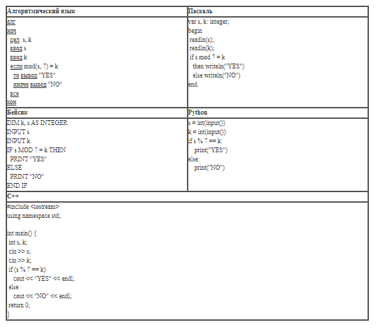 Имеем условие : если при делении s на 7 в остатке получается число k, то программа будет выдавать результат "YES", если в остатке получается другое число то "NO".