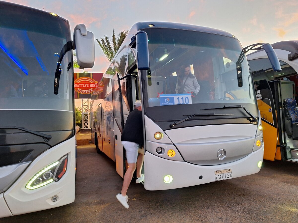 Накануне на вацап пришла СМС, выезд в 01:10. За мной приехал микрик, из близлежащих отелей собрали часть группы и направились в саму Хургаду к месту сбора, к большому комфортабельному автобусу. Автобус был от туроператора, и табличка на переднем стекле, и гид в форменной одежде Библио Глобуса. Нас обслуживали два водителя, по регламенту; гид-египтолог; так же с нами в салоне находился сопровождающий военный в штатском, его сразу представили и сказали, что с ним никаких фото. Да и по маршруту по дороге не стоит снимать все подряд, тем более блок посты, военных и полицейских. Чревато.