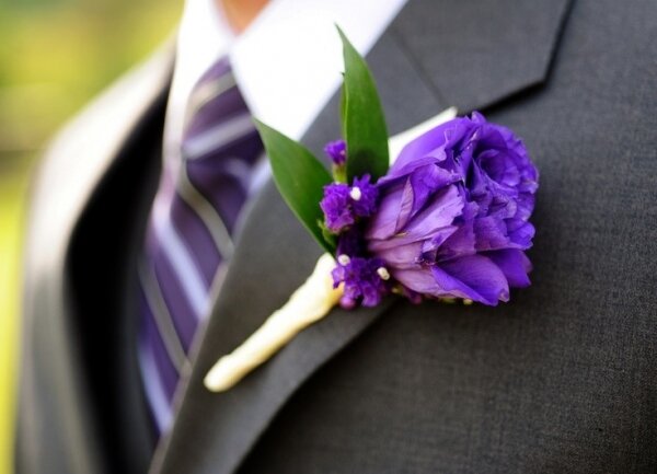 Жениху следует носить букетик на левом лацкане пиджака либо в петлице. Композиция прикрепляется к пиджаку при помощи булавок. Фиолетовые бутоньерки может носить не только жених, но и гости, например, подружки невесты или шаферы жениха. Для удобства они выполняются в разных формах – плоская, дуговидная, круглая, и могут крепиться на запястье или платье.