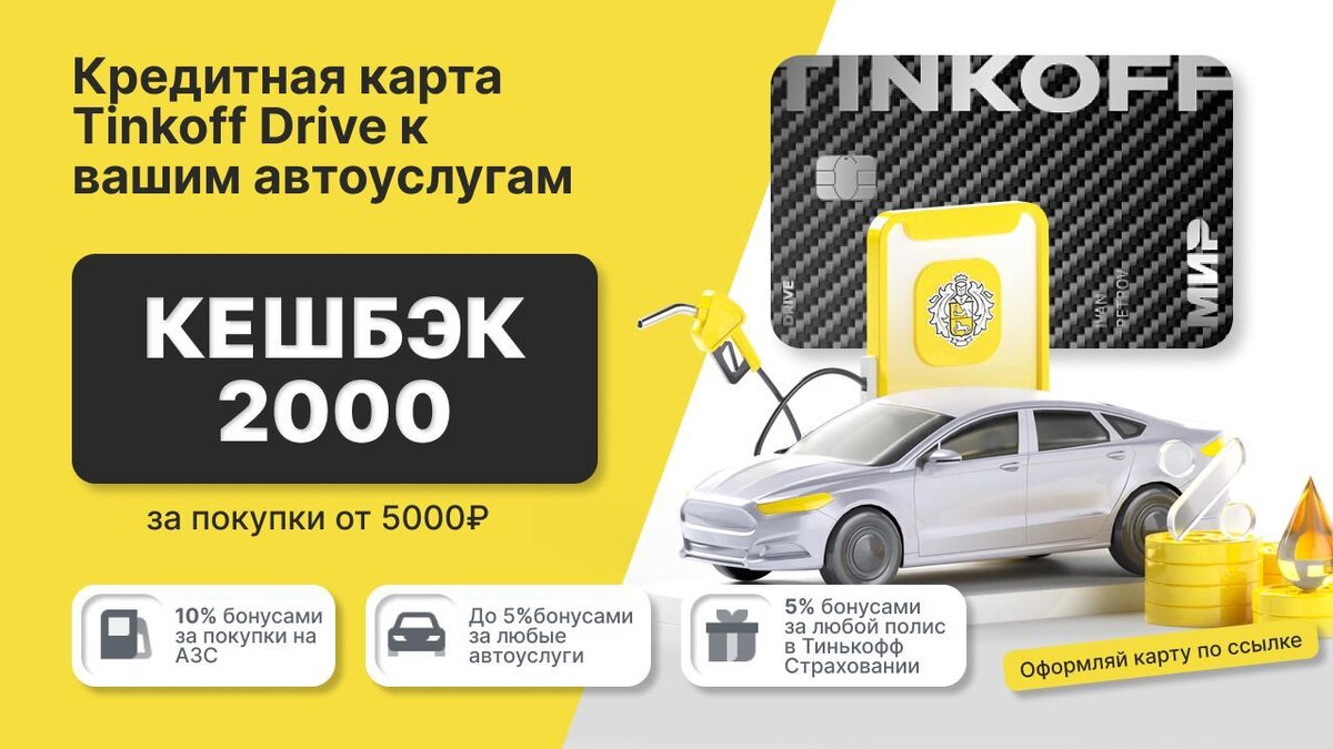 ⚡️2000 в подарок от Кредитной карты Tinkoff Drive 1. Переходим по этой ссылке 👈 2. Тратим от 5000₽ на любые покупки в течение 30 дней после активации карты 3. Получаем 2000 баллов на оплату топлива и другие покупки водителей (1 балл = 1₽) ⛽️С помощью бонусных рублей заправляем себе полный бак бензина, а так же забираем сочный кэшбэк: AЗС — 10%, любой полис — 5%, любые автоуслуги — 5%