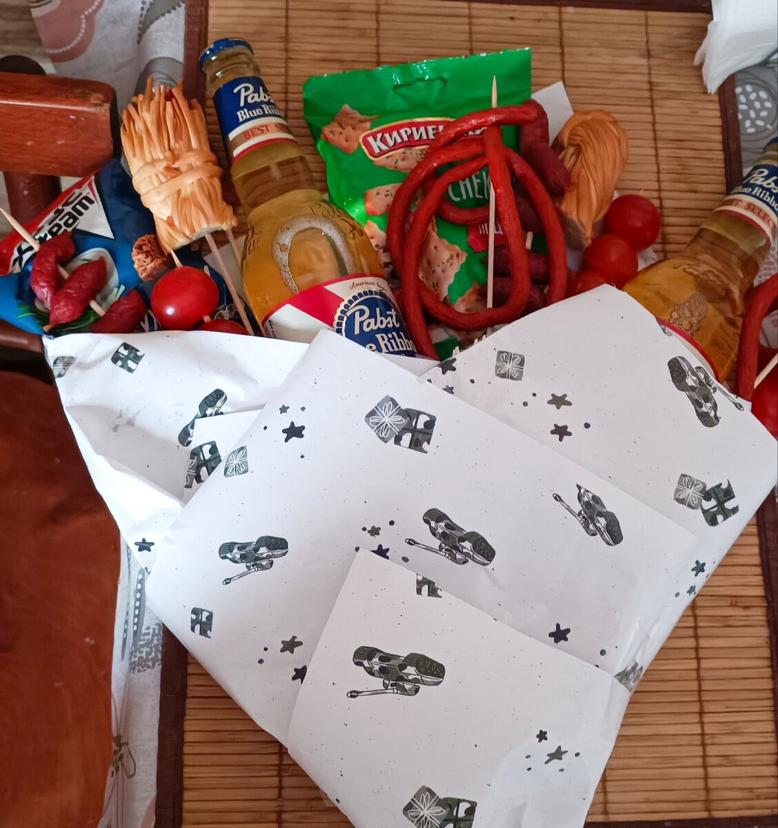 Никогда не дарила "букетов" мужчинам, но тут захотелось сделать приятное на день рождения , всё-таки 35 лет человеку. Итак, что для этого понадобилось: - деревянные палочки 30 см, покупала в Ашане, стоят 79 р за 100 шт. - упаковочная бумага . 49 р. - пенные напитки 2 шт по 69 р. -сыр косичка, разрезала напополам. 99 р. - помидоры черри ,вышло на 90 р. за 15 шт. - сухарики 20 р. - крекеры 22 р. - колбаска одна шт, порезала на 2 - 19 р за 20 гр. - ещё колбаски пикколини 49 р - длинные колбаски 89 р. На все про все ушло 654 р. Все либо надевала на шпажки,либо пачки и бутылки крепила скотчем к шпажкам. Потом просто все завернула . Мужу очень понравилось ,правда мы все почти сразу же и съели. Такое количество закуски как раз хватает на 2 напитка . Так что берите идею на вооружение ) Можно при желании добавить ещё сыра, рыбку солёную ,да и вообще все что угодно! Думаю любой мужчина оценит такой "букетик" .