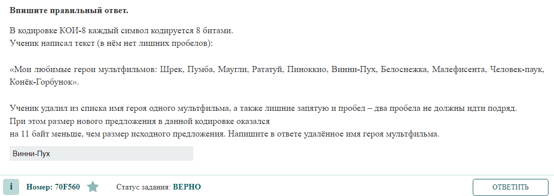 на 11 байт меньше, чем размер исходного предложения. Напишите в ответе удалённое имя героя мультфильма.