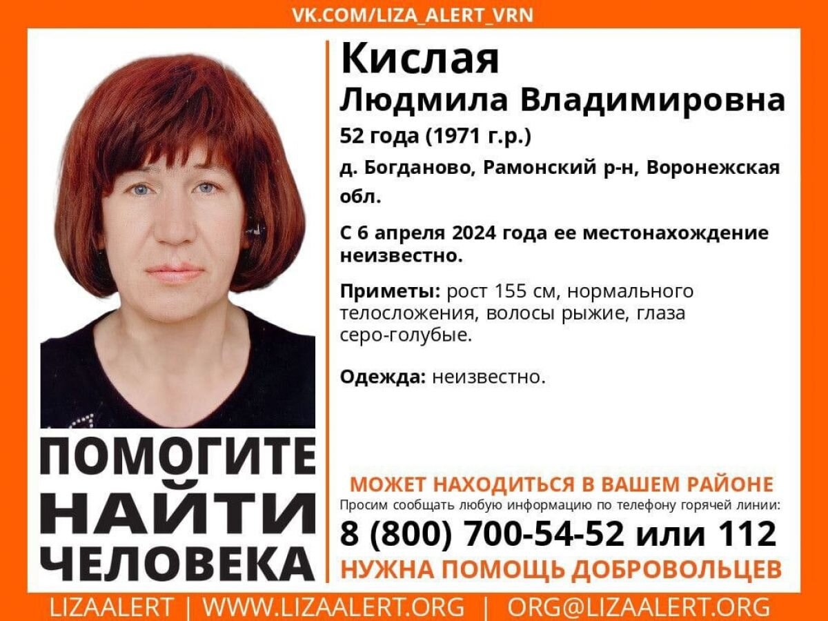 В Воронежской области волонтеры открыли поиски без вести пропавшей женщины с серо-голубыми глазами. Об этом сообщили в поисково-спасательном отряде "ЛизаАлерт". Местонахождение 52-летней Людмилы К. неизвестно с 6 апреля 2024 года. Пропавшая проживает в деревне Богданово Рамонского района. Рост женщины 155 см, нормального телосложения, у нее рыжие волосы и серо-голубые глаза. В чем была одета пропавшая в день своего исчезновения - неизвестно. Воронежцев просят помочь в поисках женщины. Если вы знаете что-либо о местонахождении пропавшей, сообщите по телефонам: горячей линии отряда 88007005452 (бесплатно по РФ) или 112.