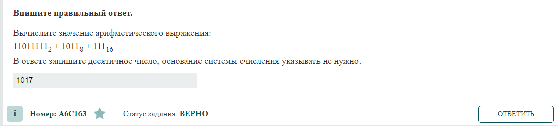 Вычислите значение арифметического выражения: 11011111₂ + 1011₈ + 111₁₆ В ответе запишите десятичное число, основание системы счисления указывать не нужно. ЧТО НУЖНО ЗНАТЬ? Правила перевода из двоичной системы счисления в десятичную Для того, чтобы перевести из 2-й в 10-ю необходимо умножить каждую цифру двоичного числа на основание “2”, возведенное в степень, равную разряду. Например, число 101₂= 1*2²+0*2¹+ 1*2⁰= 4+0+1= 5₁₀. Перевод из восьмеричной системы в десятичную Для этого необходимо умножить каждую цифру восьмеричного числа на основание «8», возведенное в степень, равную разряду числа и после этого сложить полученные результаты. Например, число 101₈= 1*8²+0*8¹+ 1*8⁰= 64+1= 65₁₀. Перевод из шестнадцатеричной системы в десятичную Для этого необходимо умножить каждую цифру шестнадцатеричного числа на основание «16», возведенное в степень, равную разряду числа и после этого сложить полученные результаты. Например, число 101₁₆= 1*16²+0*16¹+ 1*16⁰= 256+1= 257₁₀. РЕШЕНИЕ 11011111₂=1*2