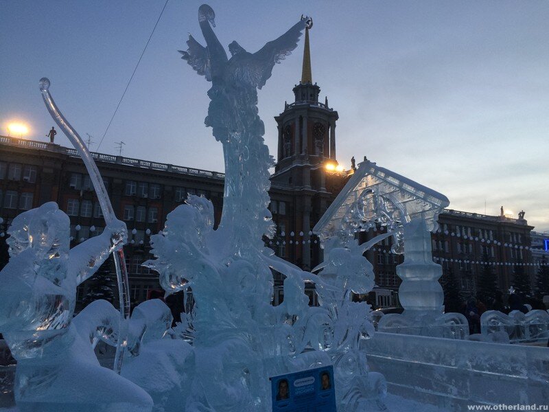 Новый 2016 год открылся небольшой поездкой на Урал. В праздники сели на самолет и укатили в царство настоящей зимы - Урал. Все дни на улице было около -30 градусов. Несмотря на холод, небо ясное, настроение хорошее. По прилёту нас встретили. Самого маленького члена команды, которому на морозе находиться было не желательно, было кому оставить и поэтому нам удалось немного погулять по Екатеринбургу. Самое первое место куда стоит метнуться, если уж вы приехали в Новогодние праздники в Екатеринбург, это центр. На площади 1905 года просто строят просто фантастические ледяные городки: Хочу отметить, что уральские -30 переносятся намного легче, чем московские или питерские. Тоже, конечно, холодно, но вполне себе можно гулять. Возьмём пошире. Ёлка на месте. Народу море. Напомню, на улице достаточно холодно. Но никого это не пугает: Ледяные произведения искусства. Под каждой скульптурой табличка, указывающая автора. Примечательно, что были работы не только мастеров из Свердловской области, но и