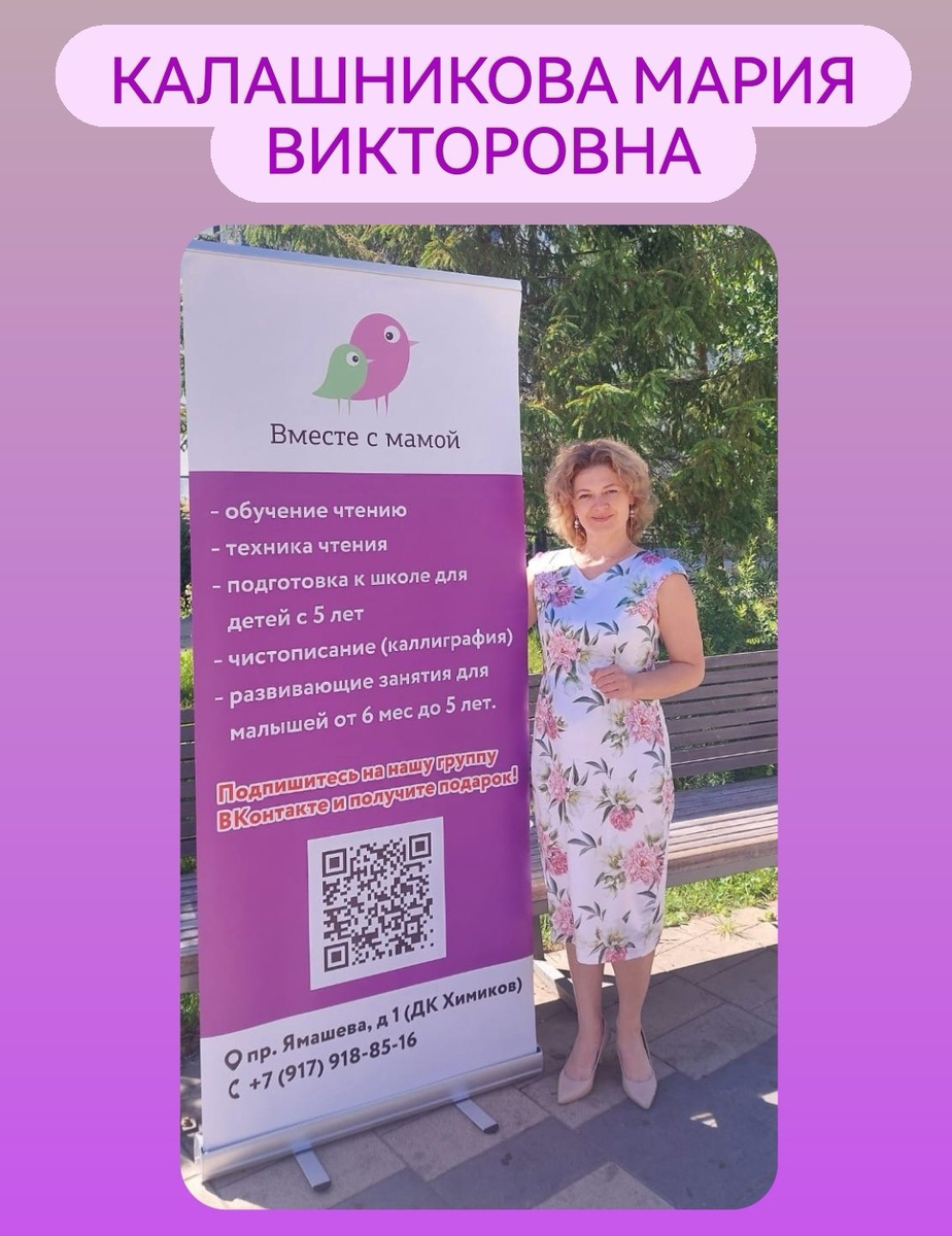 👩🏫Калашникова Мария Викторовна - руководитель и основатель студии «Вместе с мамой». Основала студию 12 лет назад. Лидер позитивных изменений, педагог курсов «Обучение чтению», «Техника чтения», «Азбука», «Таблица умножения», «Решение текстовых задач», маркетолог проекта.
