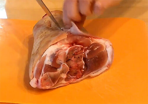 © KM-Doma.ru 1. Подготовка рульки. Кожу срезаем с голяшки очень аккуратно, нельзя задевать основные волокна. Кожу натягиваем и отрезаем по волокнам. Кожу сняли, убираем её в морозилку – будем её использовать при приготовлении холодца. Подготовленный кусок голяшки протыкаем ножом по всей поверхности – это нужно для лучшего проникновения соли и специй. Посыпаем рульку солью, черным молотым перцем, мускатным орехом и слегка прихлопываем рукой. Эту процедуру проделываем с каждой рулькой. На сков