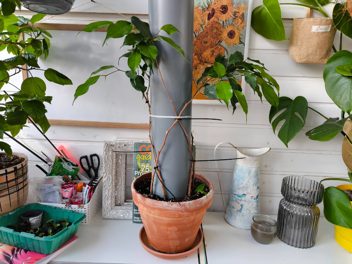Я не ожидала , что Бенджи начнет такой стремительный рост, после всего, что ему приходится переносить 😄Спустя 2 недели пора опять обновлять хомуты. Как видите по фото - хомут уже опять врезается в кору, а я в этот раз делала их гораздо слабее, оставляла стволикам несколько миллиметров на рост в ширину. Сцепились хорошо, только опять немного ободрала кору, пока снимала хомут. В высоту тоже дал хороший прирост. Снова перевершиниваю, чтобы была примерно одна высота у всех стволов, а так же убираю некоторые боковые побеги. Обязательно убираю те, которые растут внутрь и те, которые начинают дресневеть. Еще через 2 недели буду делать уже новый ряд сцепок. Очень рада такому стремительному росту, но он конечно не сам по себе так стартанул. Рассказываю: сначала я попробовала метод на другом Бенджи - который самый большой. Насыпала по верху горшка качественный биогумус и поливала как обычно. Через 2 недели у меня проснулись практически все вершины и я провела обрезку. Это был конец февраля и м