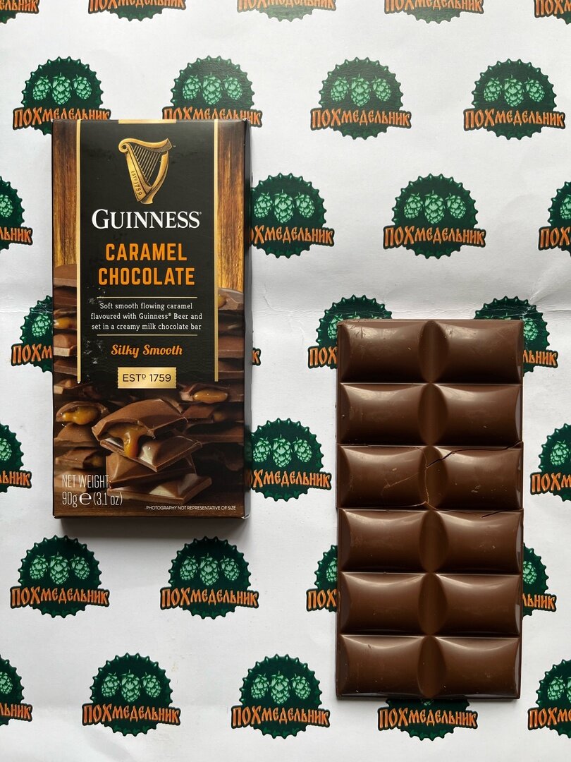 Статистика: молочный шоколад с карамельной начинкой, состав: сахар, глюкозный сироп, какао-масло, сухое цельное молоко, какао-масса, сухая сыворотка (содержит молоко), сгущенное молоко, кокосовое масло, пиво Guinness (2%) (содержит ячмень, глютен), ароматизаторы, нейтральный спирт, эмульгатор (соевый лецитин), морская соль. Масса нетто: 90 г Дата изготовления: 30.09.2023 Изготовитель: Lir Chocolates Ltd, Ireland. Импортер: ООО «Кларжес Импорт», Россия, г. Москва По-братски: если вы давно следите за моим блогом, то наверняка видели обзоры на чипсы под брендом Guinness. Но как не все знают, под брендом пива Guinness выпускают не только, конечно же в первую очередь пиво, но и шоколад. Вообще версий шоколада довольно много. Купить его в России тоже можно, я вот заказал на «Озон», само собой, что цена кусается, ну а с другой стороны - это импорт. Давайте его попробуем. Молочный умеренно сладкий шоколад, мягкий, хорошая сладкая карамельная начинка, карамель тянется, в послевкусие как раз ула