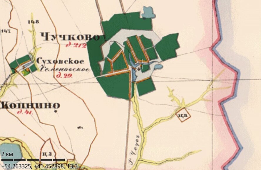 "А межа учинена Филькину поместью з братьею чети деревни Семениковской Суховской с Семеновым, да с Ывашковым, да Олешкиным поместьем Ратаевых детей Сухова с трема четьми деревни Семениковской же (Л. 615 об.) Суховской, едучи из деревни Суховской через речку Воронок, на поле в околице на горе столб, а на нем две грани, а от столба в поле на столб у дороги, что ездят ис села ис Чючкова в село на Угол ( см. статью про Протасьев Угол прим. авт.), на нем две грани, а от столба на столб на змеине, а на нем две грани, а от столба на столб ж, а на нем две грани ж, а от столба на столб, а на нем две грани, а от столба на столб на рагу, а на нем две грани, а от столба на дуб к Бегуновскому (Л. 616) рубежу, а на нем две грани, а з дуба прямо к Бегуновскому рубежу направе земля Семена, да Ивашка, да Олешки Сухова, а налеве земля Фильки з братьею Мясоедовых."