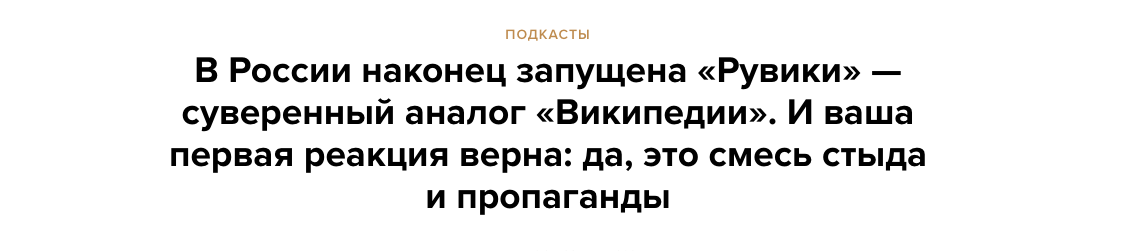 Поражаюсь, как много говноедства можно положить в один лишь заголовок. СМИ уже в заголовке сообщает читателям, как им следует относиться к "Рувики" – стыдиться, кринжевать и шеймиться. Особенно полезны такие подводки к контенту для аудитории, которая раздрочила себе мозг тик-токами и не читает дальше заголовка. А между тем, "Рувики" выглядит очень даже симпатично и достойно на фоне дизайна сильно устаревшей уставшей "Википедии" (в которой разумеется совсем нет пропаганды, одна непредвзятая истина).