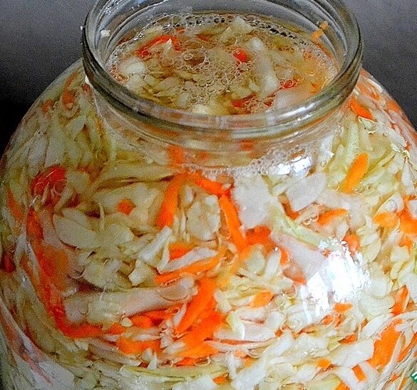 Здравствуйте, дорогие друзья!) Все мы знакомы с детства с этим простым, незамысловатым продуктом как квашеная капуста.И большинство людей особо не задумывались о какой то пользе и пищевой ценности этого продукта. На деле же квашеная капуста обладает кучей полезных свойств. Помогает пищеварению, содержит витамин С, улучшает иммунитет, снижает"плохой холестерин", благоприятно действует на сердечно-сосудистую систему, замедляет процессы старения,помогает похудеть и т. д. Сегодня хотим поделиться простым рецептом квашеной капусты, который отличается от классической его версии, но мы перепробовав разные варианты, остановились на этом и квасим капусту так уже много лет. Что требуется: Качан капусты 2-2,5 килограмма, Одна небольшая морковь , Соль, Лавровый лист, Чёрный перец горошком, Литр кипячёной воды Заранее кипятим литр воды, охлаждаем еë. Растворяем в ней две столовые ложки соли с небольшой горкой. Нарезаем капусту средней соломкой. Просто ножом или на тëрке-шинковке,кто как