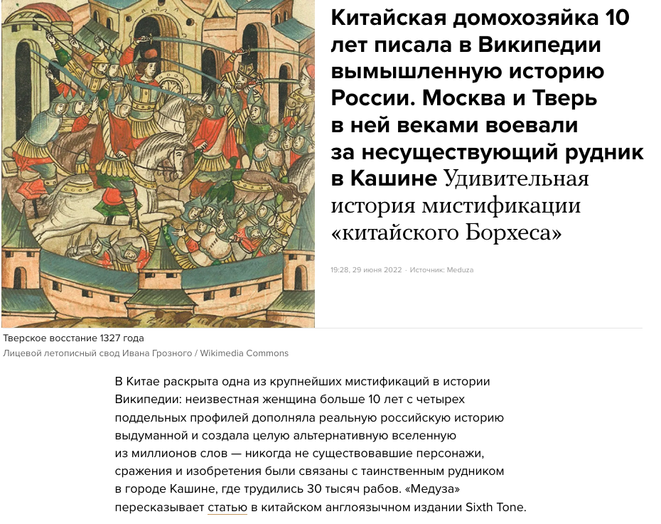 Медуза пишет, что российский "Рувики" (аналог "Википедии") – смесь стыда и пропаганды, и в то же время рассказывает, как какая-то баба 10 лет на Википедии писала выдуманный фанфик про войну за российский рудник и выдавала ее за 1000% правду. Но только в "Википедии" такая лживая херня называется удивительной историей мистификации, а в "Рувики" – стыдом и пропагандой. Не перепутайте!