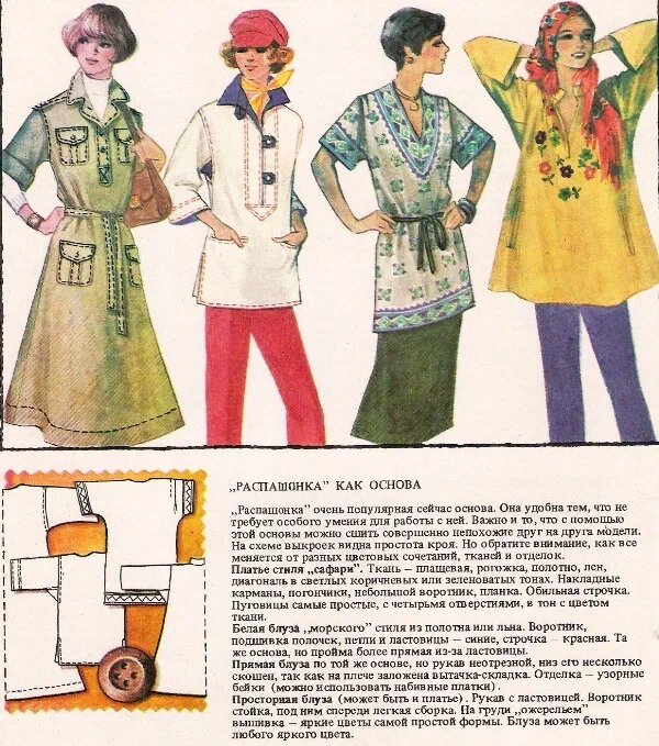 Распашонка как основа „Распашонка” очень популярная сейчас основа. Она удобна тем, что не требует особого умения для работы с ней. Важно и то, что с помощью этой основы можно сшить совершенно непохожие друг на друга модели. На схеме выкроек видна простота кроя. Но обратите внимание, как все меняется от разных цветовых сочетаний, тканей и отделок. Платье стиля "сафари". Ткань плащевая, рогожка, полотно, лен, диагональ в светлых коричневых или зеленоватых тонах. Накладные карманы, погончики, небольшой воротники, планка. Обильная строчка. Пуговицы самые просто, четырьмя отверстиями. в тон с цветом. Белая блуза „морского” стиля из полотна или льна. Воротник, подшивка полочек, петли и ластовицы — синие, строчка красная. Та же основа, но пройма более прямая из-за ластовицы. Прямая блуза по той же основе, но рукав неотрезной, низ его несколько скошен, так как на плече заложена вытачка-складка. Отделка — узорные бейки (можно использовать набивные платки). Просторная блуза (может быть и плат