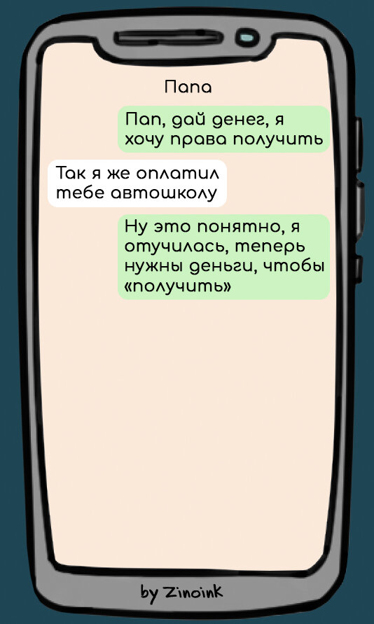 До получения прав многих парней вождению учат отцы. При чем там школа посерьезнее! Только попробуй поцарапать «ласточку» или громко хлопнуть в ней дверью). Парень из следующей переписки явно прошел эту непростую школу вождения).