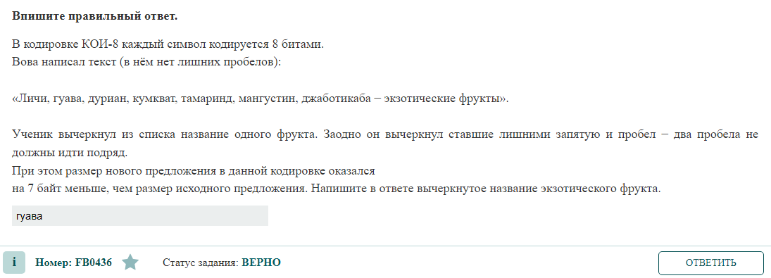 на 7 байт меньше, чем размер исходного предложения. Напишите в ответе вычеркнутое название экзотического фрукта.