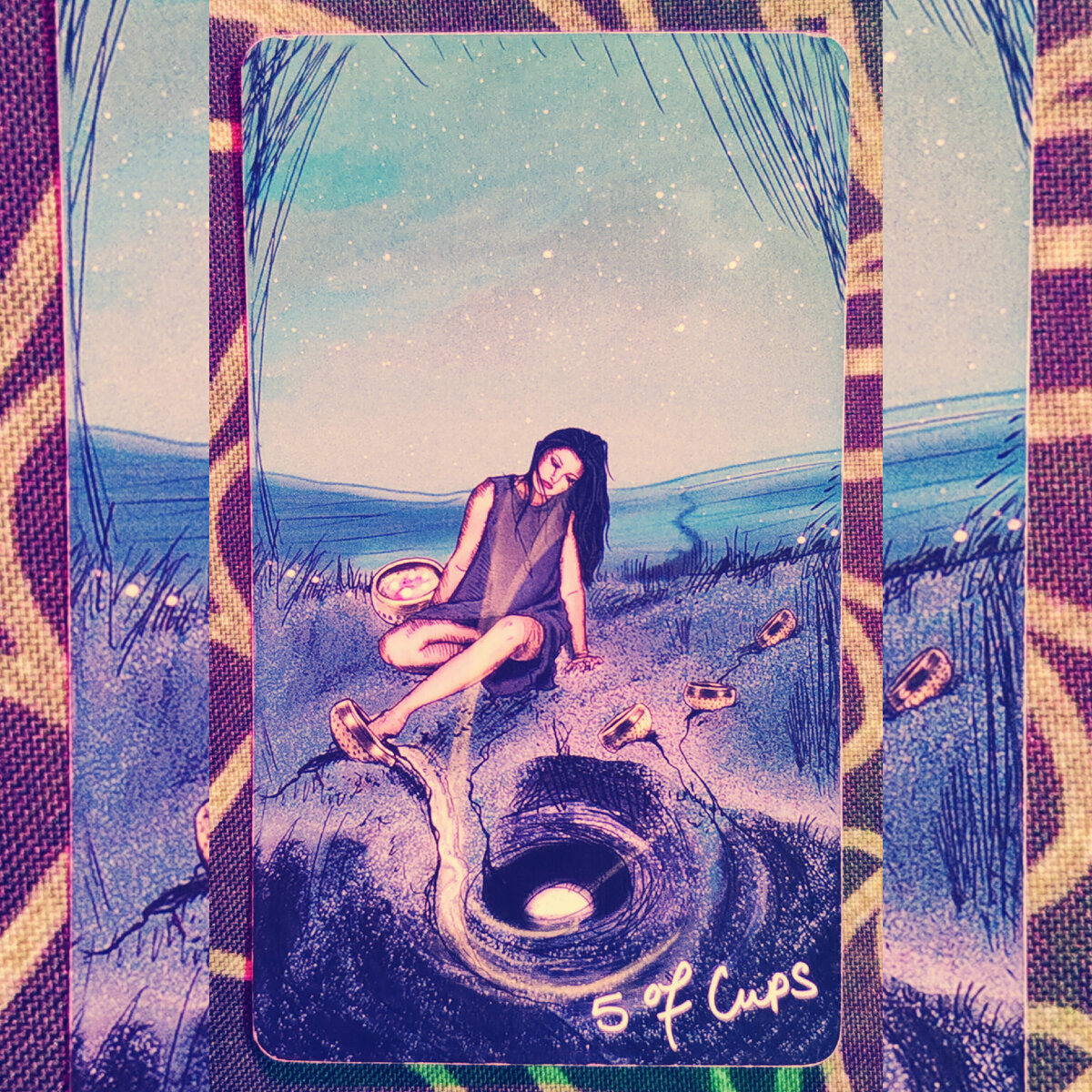 Сегодня у нас с тобой снова выпали кубки, а значит тема разных эмоциональных проявлений продолжается. Давай рассмотрим эту карту повнимательнее, ведь каждый раз нужно замечать детали, тогда расклад будет более точный. Даже расклад из одной карты, может дать максимум полезной информации. Итак, карта у нас пятёрка кубков. Что же мы видим на ней? Девушка сидит очень грустная, о чем то думает или что-то вспоминает, и параллельно сливает полный кубок в какую-то подземную воронку. Рядом с ней уже лежат пустые кубки, но есть один полный, но она его как-будто не замечает. Сосредоточена на на том из которого все уходит. Эта карта нам говорит о том, что в этот день мы будем сильно зациклены на негативе в нашей жизни. Будем думать больше о том, чего у нас нет или о том, что нам не доступно, вместо того, чтоб сконцентрироваться наоборот на позитиве, на том, что мы имеем. Эта позиция всегда приводит нас к проигрышу, так как идёт слив эмоций и энергии вникуда. Видимо день будет такой, но поста