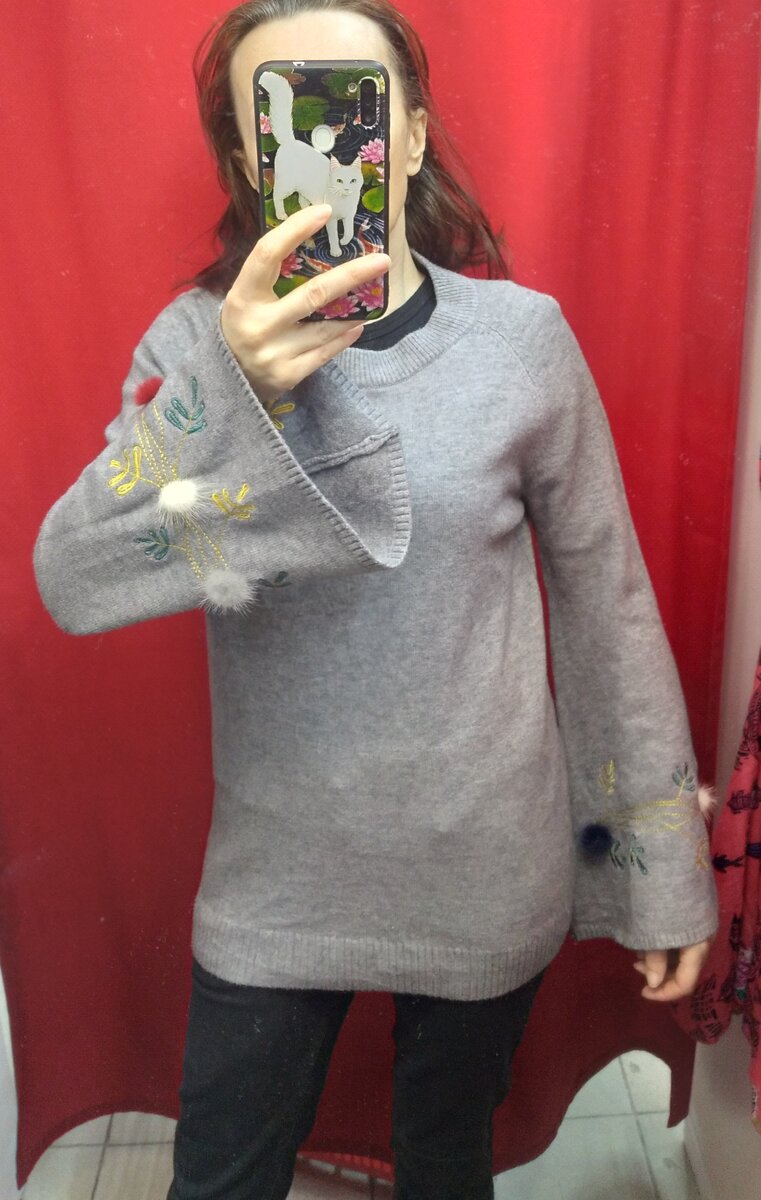 Здравствуйте. Не зря я родилась в год мыши, могу просочится в любую толпу, легко там лавирую, не могу не сыронизировать, что мы мыши мощные звери и дамбы сносим за раз))), а толпа в секонде это раз плюнуть. Главное, чтобы не общаться, я же интроверт. Я легко ввинтилась в толпу и вытащила, то ли парку, то ли плащ, покупку покажу завтра)). А сейчас то, что просто сфоткала. Серый джемпер с шикарными рукавами, из-за этих рукавов и хотела взять. Хотя есть минус, например, под верхнюю одежду надеть такой джемпер очень неудобно, рукава будут мешаться, мяться , а может даже действовать на нервы))). Вышивка и меховые помпончики или просто кусочки. Перед кассой я начинаю пристально осматривать будущие покупки, если только на зуб не пробую,))) и на груди нашла приличное пятно, может просто воду на себя разлили, не особо видно, но этого оказалось достаточным, чтобы не связываться. Может никто и не заметит, но я буду знать. А вдруг не отстирается? Длинный пуловер серо-бежевого цвета с карманами,