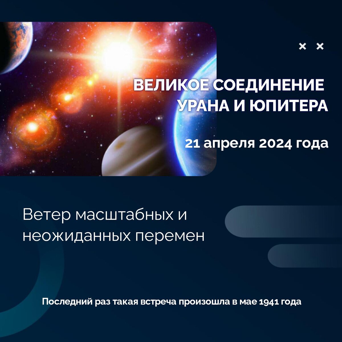 💌 Встреча двух планет, Юпитера и Урана состоится 21.04.2024г. в 22 градусе знака Тельца, символом которого является: "Белый голубь летит домой над бурными водами". Свобода в понимании; сила, основанная на обладании истинной миссией. Самоосвобождение, духовная инспирация, приходящая к индивидууму после преодоления кризиса. 💌 Планета Уран ассоциируется не просто с глубокими переменами, но с переменами неожиданными и внезапными. Юпитер любит всё расширять и увеличивать, создавать масштаб! Поэтому, когда на небе встречаются такие две планеты – это всегда большое событие. 💌Последний раз подобная встреча произошла 8 мая 1941 года, и мы все помним, какие неожиданные события тогда повлияли на жизнь людей. Хочу сразу же успокоить вас и сообщить, что на этот раз развитие событий будет более благоприятным, чем в мае 1941 года. Кстати, заметьте, что этот сценарий начал реализовываться спустя месяц с небольшим, 22 июня 1941 года. 💌Тогда встреча Юпитера и Урана произошла в соединении со злове