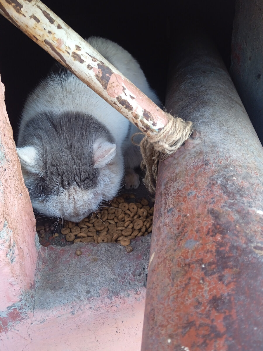 В середине марта возвращалась семейная пара вечером домой. Холод, метель, ветер... Недалеко от остановки заметили кота, сидит, явно не знает, куда идти и что делать... Пожалели, принесли в подъезд. К себе не взяли - две собаки дома. Еды какой-то дали, тряпочку постелили. Пару дней кот в подъезде просидел, потом кто-то из жителей на улицу вынес, и пошёл кот в подвал... Мне по нему звонили - кот в подъезде сидит. А я на работе, и, честно говоря, ни сил, ни времени этим котом заниматься не было... Эта зима мне очень тяжело обошлась, во всех смыслах. Морозы давили, болела, иногда еле сил хватало своих подопечных доползти покормить. И на передержках кошки, на корм денег надо, и уличных кормить... Знать бы заранее, во что это выльется. Сама виновата, что уж... Кот две недели в подвале прятался, я его не видела. Сотрудники ТСЖ видели, говорили, бегает тут с другими кошками в подвале. А потом потеплело, и кот вылез.. Весь в проплешинах и расчесах. Меня не боялся, ел у ног. Позвонила в ветк
