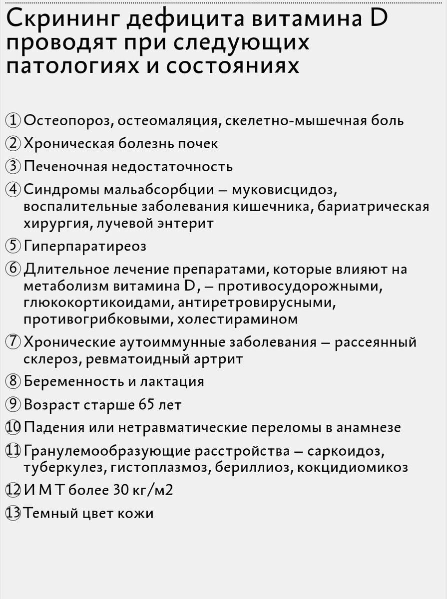 С наступлением весны используйте каждую свободную минуту для пребывания на солнце. Как показали исследования Манчестерского университета, достаточно 10-15 минут ежедневного пребывания на солнце весной и летом с открытыми руками и ногами, чтобы витамина D хватило на весь год. Кому нужно сдавать анализ на витамин D? Массовый скрининг на дефицит витамина D эксперты не рекомендуют. Если вы моложе 65 лет, у вас нет перечисленных заболеваний и состояний, то сдавать анализ на витамин D вам не нужно. Какие нормальные значения витамина D в сыворотке крови? Витамин D назначается при подтвержденном дефиците, то есть с концентрацией 25(OH)D в сыворотке крови ниже 20 нг/мл. Прием витамина D при концентрации от 20 до 30 нг/мл является спорным и дискуссионным. Как принимать витамин D? Витамин D назначают в эквивалентных дозах 1 раз в день, в неделю, в месяц. Результат лечения оценивают через 6-12 недель после начала приема витамина D. Чем опасен переизбыток витамина D? Прием витамина D имеет нако